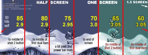 To measure past 1 screen needs a little trick. What I do is first look to see where exactly 1 screen is. I lock my eyes onto some part of the background (or if you're lucky, some teammate/enemy) that is exactly 1 screen away from me. Then I drag the screen so that whatever I locked onto will be lined up with the left edge of my screen. Then measuring is the same as before... the shot 2 button will be 1.25 screens, and the middle of your first dual will be 1 and 1/2 screens.