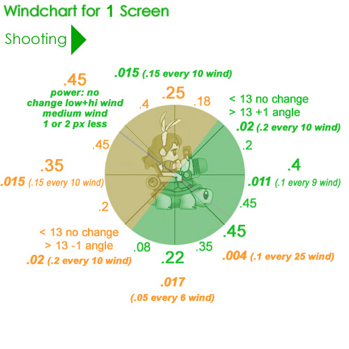 Therefore, raise angle by (1/5th of 20) which is about 4. You're also going to have to lower power. The rule is (.2 every 11) so if it were 11 wind, you'd lower .2 bars exactly... if it were 22 wind, you'd lower .4 bars. Since this is a bit less than 22 wind, you will lower a bit less than .4 bars. Call it .35 bars. So - your basic half screen angle is 66, 1.97 Your angle change is 4, so now you will shoot at 70. Your power change is .35, so the new power is 1.62. Angle 70, 1.62 will make a nice timebomb in this wind.