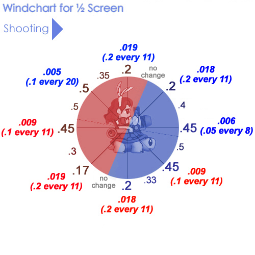 Between half and 3/4 screen: The half screen chart is mostly accurate, but you adjust your angle less than before. For example, in 20 wind blowing against you... you might adjust 10 angles for a half screen shot but only 9 angles for a 2/3 shot, and 8 for a 3/4 shot. Other wind factors decrease slightly as well. You might notice the windchart has a lot of factors near .5 ...when shooting 2/3 to 3/4 screen, try using .4 factors in place of these .5's and you'll probably get the correct angle.